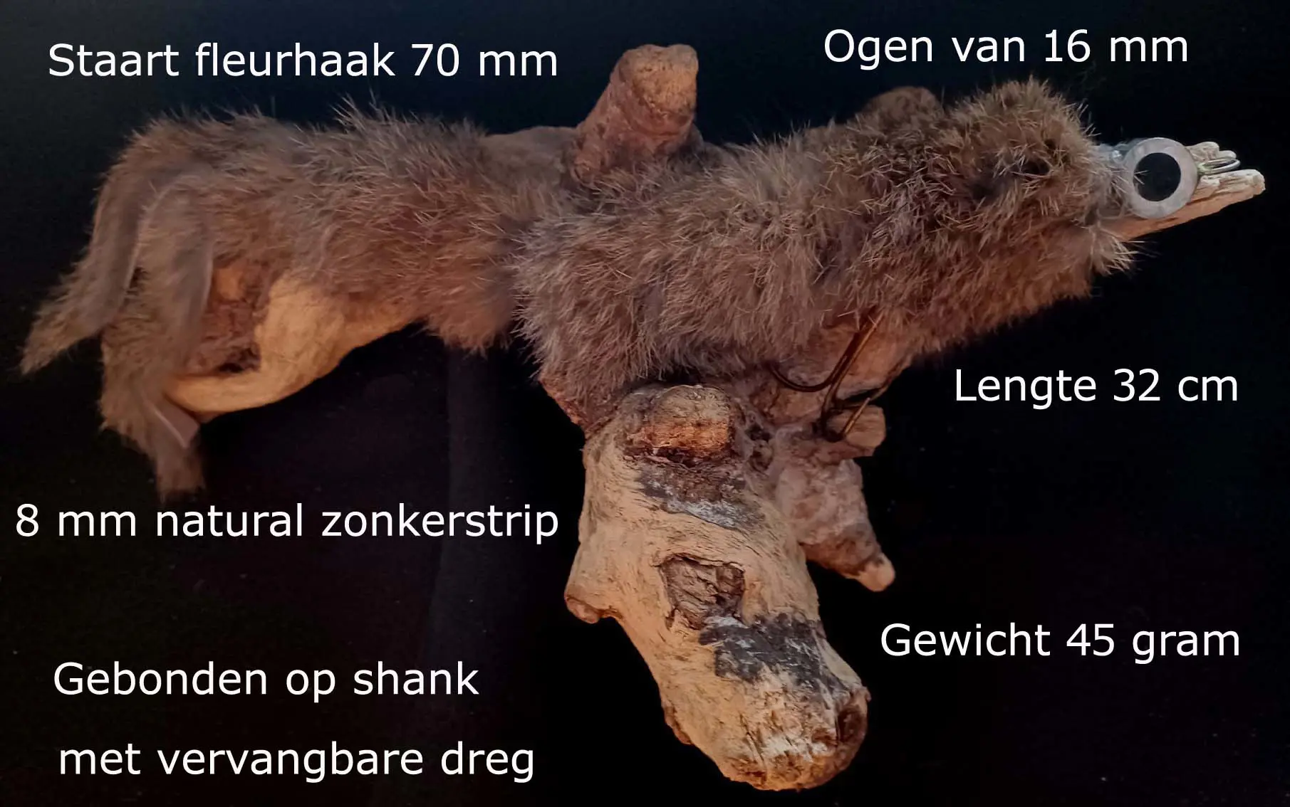 De streamer is gebonden op een shank met een Dreg en een Double hook / Fleurhaak van 7 cm.