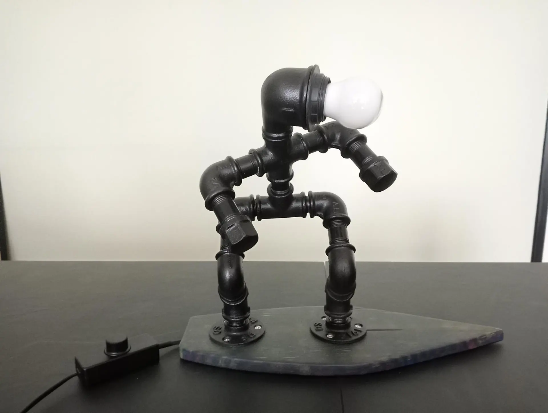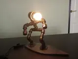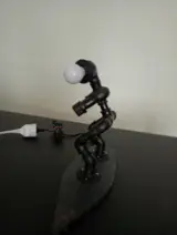 Te koop (nieuw)Industriële handgemaakte streampunk lamp motief surfer incl. lamp en dimschakelaar Afmetingen : lengte 37 cm , hoogte 30 cm , breedte 13 cm .Materialen : Metaal ,hout en elecktra