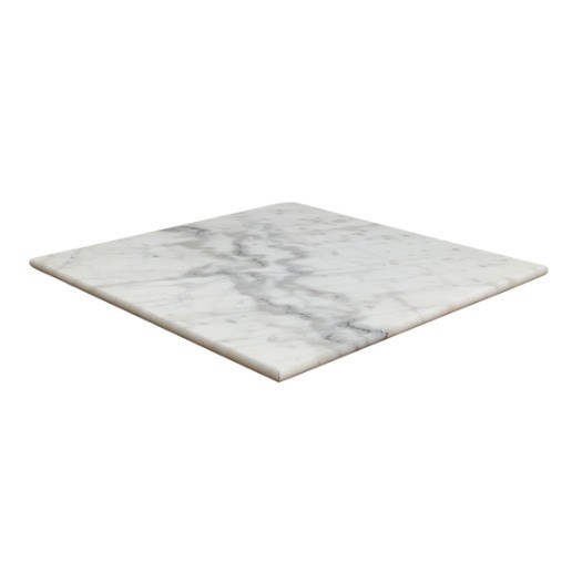 Vierkant wit marmer tafelblad met kleurschakeringen waar aders en kristallen inzitten. Het marmer (natuursteen) tafelblad is 2 cm dik en heeft een afmeting van 60 x 60 cm. Dit tafelblad is aan de onderkant voorzien van een metalen plaat waarmee het tafelblad aan het onderstel gekoppeld wordt.