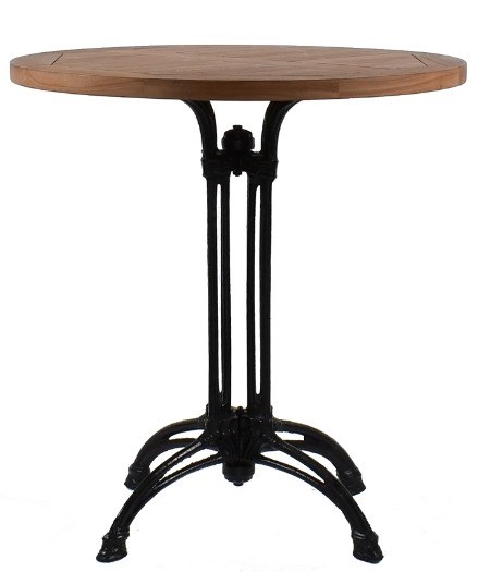 Terrastafel met rond teakhouten tafelblad en gietijzer tafelonderstel. Het tafelblad is gemaakt van onbehandeld teak en heeft een doorsnede van 70 cm. Het gietijzeren onderstel heeft een 4 poot voet. De hoogte van de tafel is 74 cm. Deze teakhouten tafel is stevig en stabiel en geeft sfeer aan tuin, balkon, terras of horecagelegenheid.