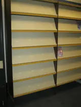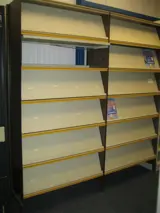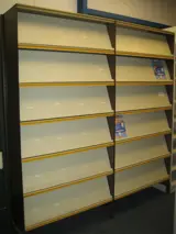 Tijdschriftenkast, 2x 6 etages met voorraadruimte, bruin/beige, legborden en staanders van metaal, de achterkant is niet gesloten,