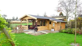 Typenummer 4x3+2Z Breedte: 565 cm Diepte: 515 cm Oppervlakte: 25.92 m² Wanddikte: 50 mm Zijwandhoogte: 208 cm Nokhoogte: 265 cm Ramen: 1x Dubbel draaikiep raam1x Enkel draaikiep raam Deuren: 1x Dubbele deur1x Zijaanbouwdeur Glas: BC-kwaliteit Type dak: Zadeldak Houtsoort: Noord-Europees vuren kwaliteitshout Bouwsysteem: Blokhut-systeem
